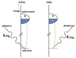 RIXS is a two steps process. First an electron is resonantly excited from a core level, defined by the absorption edge, to an empty state, leaving a core hole. The intermediate state with the core hole has a lifetime of few femtoseconds, then the system radiatively decays into the final state with the filling of the core hole and the emission of another photon. Since the probability of a radiative core hole relaxation is low, the RIXS cross section is very small and a high brilliance X-ray source is needed. Being a second order process, the RIXS cross section is described by the Kramers-Heisenberg formula.[1][5]