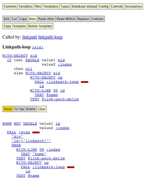 Although Yahoo!'s documentation does not mention it, RTML is actually implemented on top of a Lisp-based system. The language is somewhat unusual in that the programmer cannot edit the source code directly as text. Instead, keywords are presented as hyperlinks in a browser-based HTML interface. Clicking on a keyword selects it, and its attributes can be edited. Blocks of code can be pushed and popped from a clipboard, using the stack metaphor. The editor maintains the code's s-expression structure automatically, and visually represents it in the web interface using indentation instead of Lisp's parentheses. Most of the keywords correspond to HTML elements, but there are also conditionals, recursion, and other control flow features that make it a "real" programming language.