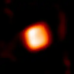 Images obtained using the SURFING algorithm result in a limb-darkened angular diameter of 2.45 mas, corresponding to a linear radius of 900–1,760 R☉ depending on the adopted distance.[13] In 2024, the star's size was shown to have increased by 8% since its 2022 dimming. The angular diameter, combined with an average distance of 3,935 pc (12,830 ly) to Berkeley 94, gives a radius of 1,100 R☉.[11]