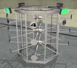 The Rack 'n Roll field is dominated by 'The Rack', a large metal contraption with three levels of hanging metal bars, with each level having 8 arms evenly spaced in an octagonal manner. Each arm (known as a 'spider leg') has space for two game pieces. Any more pieces placed on a spider leg beyond the first two are ignored for scoring purposes. At the beginning of the match, the rack is arbitrarily translated or rotated within three feet of the center of the field in order to give some randomness and to encourage autonomous modes that do not depend on dead-reckoning. At the top of the Rack are four green-colored lights above the 1, 3, 5, and 7 legs to aid in autonomous-mode tracking.