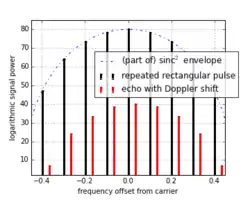 This is an issue only with a particular type of system; the pulse-Doppler radar, which uses the Doppler effect to resolve velocity from the apparent change in frequency caused by targets that have net radial velocities compared to the radar device. Examination of the spectrum generated by a pulsed transmitter, shown above, reveals that each of the sidebands, (both coarse and fine), will be subject to the Doppler effect, another good reason to limit bandwidth and spectral complexity by pulse profiling.