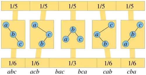 Two random distributions on three-vertex binary trees, the binary search trees on three keys a, b, and c. These five trees are each assigned probability 1/5 by the uniform distribution (top). The distribution generated by random insertion orderings (bottom) assigns the center tree probability 1/3, because two of the six possible insertion orderings generate the same tree; the other four trees have probability 1/6.