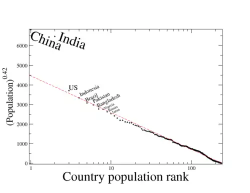 All are real-world observations that follow power laws, such as Zipf's law, the Yule distribution, or the Pareto distribution. If one ranks the population size of cities in a given country or in the entire world and calculates the natural logarithm of the rank and of the city population, the resulting graph will show a linear pattern. This is the rank-size distribution.[9]