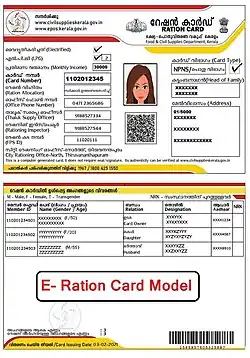 Ration cards are an official document issued by state governments in India to households that are eligible to purchase subsidised food grain from the Public Distribution System under the National Food Security Act (NFSA). They also serve as a common form of identification for many Indians.[1]