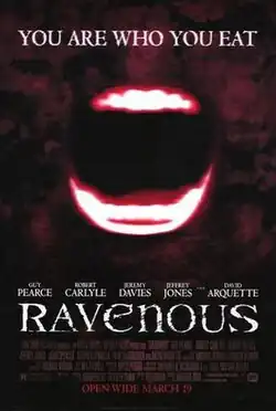 Ravenous is a 1999 film starring Guy Pearce, Robert Carlyle, Jeffrey Jones and David Arquette.[3] The film, which is set in 1840s California, was directed by Antonia Bird and filmed in Europe. It was not a box office success and failed to recoup much of its $12 million budget. However, despite initial reception being mixed when released, it has since garnered a reputation as a cult film.[4] The film is an international co-production between United Kingdom, United States and Mexico.
