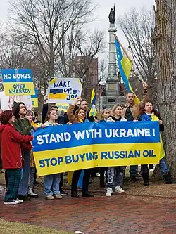 UK Prime Minister Boris Johnson among others has warned of the danger of "Ukraine fatigue" and "stressed the importance of allied nations showing they would stand by Kyiv for the long-term".[57][58] According to the Rand Corporation, "Russia's strategy seems to be largely based on protraction: Let the war grind on, and eventually the United States and its allies will lose interest, and the Ukrainians will cave."[59] Several European newspapers, working from leaked Russian intelligence documents and social media photos, described Russian efforts to exaggerate anti-Ukraine sentiment by photographing a few protestors holding anti-Ukraine signs against a backdrop of large demonstrations about other matters.[60][61]