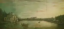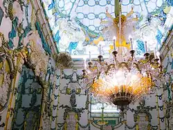 Gricci had made a chinoiserie porcelain room, the Porcelain boudoir of Maria Amalia of Saxony, at the Palace of Portici near Naples (now moved to the Palace of Capodimonte), and was soon asked to make another one at the Palace of Aranjuez, which he made and installed between 1763 and 1765, at a cost of 571,555 Spanish reales.[2] The factory made another room, rather smaller and in a Neoclassical style, for the main Palacio Real, Madrid. This was designed by Carlo Schepers in the 1770s, and cost 256,958 reales.[2] Both these had walls largely of plain white plaques, over which lay a network of coloured elements in a medium to high relief, made up of plant motifs and figures.