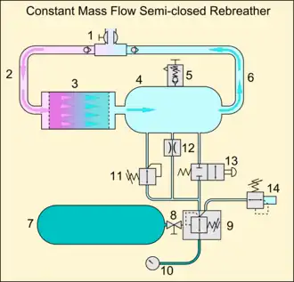 A rebreather retains most of the exhaled gas for re-use and does not discharge it immediately to the surroundings.[3][4] The inert gas and unused oxygen is kept for reuse, and the rebreather adds gas to replace the oxygen that was consumed, and removes the carbon dioxide.[3] Thus, the gas recirculated in the rebreather remains breathable and supports life and the diver needs only to carry a fraction of the gas that would be needed for an open-circuit system. The saving is proportional to the ambient pressure, so is greater for deeper dives, and is particularly significant when expensive mixtures containing helium are used as the inert gas diluent. The rebreather also adds gas to compensate for compression when dive depth increases, and vents gas to prevent overexpansion when depth decreases.[2][5][1]