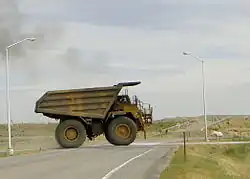 A truck hauling coal for the Jim Bridger Power Plant near Point of Rocks, Wyo., dwarfs a nearby wild horse.