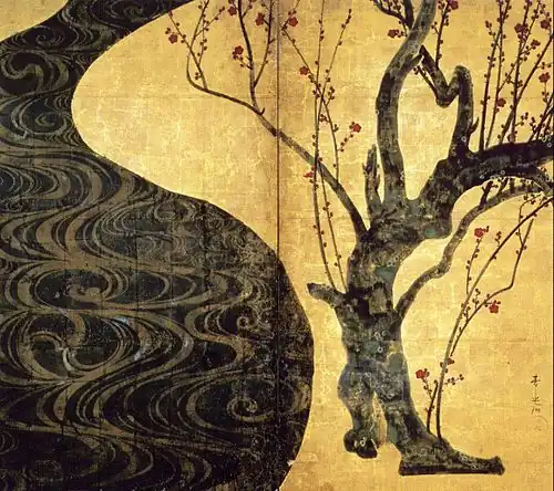 Red and White Plum Blossoms (紙本金地著色紅白梅図 shihonkinjichakushoku kōhakubaizu) is an early 18th-century painting on a pair of two-panel byōbu folding screens by Japanese artist Ogata Kōrin (1658–1716).[1] The simple, stylized composition depicts a patterned flowing river with a white plum tree on the left and a red one on the right. The plum blossoms indicate the scene occurs in spring.