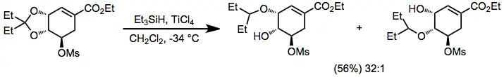 Acetals, ketals, and aminals are reduced in the presence of hydrosilanes and acid. Site-selective reduction of acetals and ketals whose oxygens are inequivalent have been reported—the example below is used in a synthesis of Tamiflu.[18]