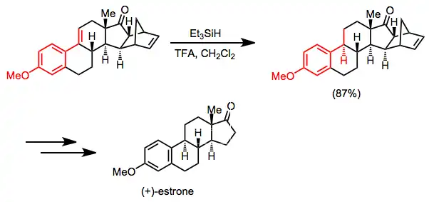 A synthesis of (+)-estrone relies on selective hydrosilane reduction of a conjugated alkene as a key step. The ketone carbonyl and isolated double bond are unaffected under the conditions shown.[17]