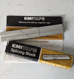 Tape editing is performed simply by cutting the tape at the required point and rejoining it to another section of tape using adhesive tape, or sometimes glue; it is called a splice. The adhesive tape used in splicing has to be very thin to avoid impeding the tape's motion, and the adhesive is carefully formulated to avoid leaving a sticky residue on the tape or deck. Butt splices (cut at exactly 90 degrees to the tape travel) are used for fast edits from one sound to another, though preferably, the splice is made at a much lower angle across the tape so that any transitional noise introduced by the cut is spread across a few milliseconds of the recording. The low-angle splice also helps to glide the tape more smoothly through the machine and push any loose dirt or debris to the side of the tape path, instead of accumulating in the splice joint. A side-effect of cutting the tape at an angle is that on stereo tapes the edit occurs on one channel a split-second before the other. Long, angled splices can also be used to create a perceptible dissolve from one sound to the next; periodic segments can induce rhythmic or pulsing effects.[5] The use of reels to supply and collect the tape makes it easy for editors to manually move the tape back and forth across the heads to find the exact point they wish to edit. Tape to be spliced is clamped in a splicing block attached to the deck near the heads to hold the tape accurately while the edit is made. The Editall was a long-in-production splicing block, named for its inventor Joe Tall, a tape editor at CBS.[6]