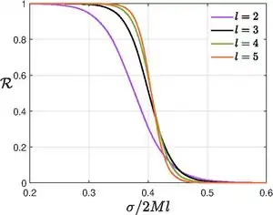 It is clear from the figure for the reflection coefficient that small-frequency perturbations are readily reflected by the black hole whereas large-frequency ones are absorbed by the black hole. The transition arises around the fundamental quasi-normal mode frequency (see below) for each multipole.