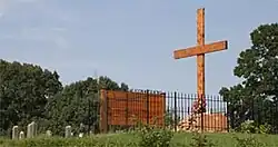 The replica was dedicated on September 25, 2005, with many descendants of the massacre victims and locals in the crowd.[55] During the dedication the stories of the surviving children were told while their descendants placed stones brought from southern Utah upon the cairn.[56] This replica is much smaller in terms of stones than the original, but it does include a large cross facing west, towards Utah, with the words "Vengeance is mine; I will repay, saith the Lord" carved into it. To the side of the replica cairn sits a large interpretative sign with the following inscription: