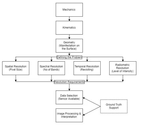 The sensor could be spaceborne (carried by satellite), airborne (carried by aircraft, or most recently Unmanned Aerial Vehicle (UAV)) or ground-based (sometimes called proximal sensing).[8] Data acquired from higher elevation captures a larger field of view/ spatial coverage, but the resolutions are often lower.[9] Prior mission planning regarding flight path, weight load, carrying sensor etc. have to be done before deployment.[8] The resolution requirement is often high in geological studies, hence airborne and ground-based systems prevail in surveying.[8]