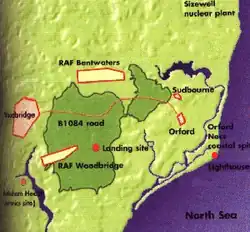 The main events of the incident, including the supposed landing or landings, took place in the forest, which starts at the east end of the base runway or about 0.3 miles (0.5 km) to the east of the East Gate of RAF Woodbridge, from where security guards first noticed mysterious lights appearing to descend into the forest. The forest extends east about one mile (1.6 km) beyond East Gate, ending at a farmer's field at Capel Green, where additional events allegedly took place.