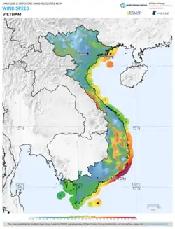 Vietnam wind resources are mostly located along its coastline of more than 3,000 km, and in the hills and highlands of the northern and central regions.[37] A World Bank ESMAP study (see the table below) estimated that over 39% of Vietnam's area had annual average wind speed over 6 m/s at a height of 65m, equivalent to a total capacity of 512 GW.[38] It was estimated that over 8% of Vietnam's land area had annual average wind speed over 7 m/s, equivalent to a total capacity of 110 GW.[29]