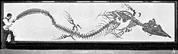 Additional largely complete skeletons of T. proriger and T. dyspelor were uncovered from the Niobrara Formation between the 1900s to 1920s by Charles Sternberg and his son George, which were sold to museums in the United States and Germany.[43] A particular find was a T. proriger skeleton collected by C. Sternberg from Smoky Hill Chalk deposits in Logan County, Kansas, in 1917, which contained digested remains of a plesiosaur within its ribcage. The specimen was sold the following year to the Smithsonian, and the mosasaur has been permanently displayed as USNM 8898.[44][45] The plesiosaur remains, despite their significance, were stashed as a separate specimen and promptly forgotten until their redescription by Everhart in 2004.[46] This rediscovery formed the basis for the plot of the 2007 National Geographic film Sea Monsters: A Prehistoric Adventure.[45] George Sternberg attempted to sell another complete T. proriger skeleton he found to the Smithsonian 1926, but the museum was satisfied with his father's earlier specimen and declined the offer. This skeleton was ultimately transferred to the Sternberg Museum as FHSM VP-3.[47]