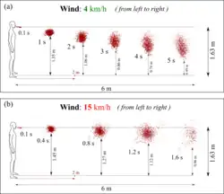 Advanced Computational Fluid Dynamics (CFD) showed that at wind speeds varying from 4 to 15 km/h, respiratory droplets may travel up to 6 meters.[13][14]