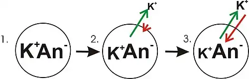 - In panel 2 of the diagram, the cell membrane has been made permeable to potassium ions, but not the anions (An−) inside the cell. These anions are mostly contributed by protein. There is energy stored in the potassium ion concentration gradient that can be converted into an electrical gradient when potassium (K+) ions move out of the cell. Note that potassium ions can move across the membrane in both directions but by the purely statistical process that arises from the higher concentration of potassium ions inside the cell, there will be more potassium ions moving out of the cell. Because there is a higher concentration of potassium ions inside the cells, their random molecular motion is more likely to encounter the permeability pore (ion channel) that is the case for the potassium ions that are outside and at a lower concentration. An internal K+ is simply "more likely" to leave the cell than an extracellular K+ is to enter it. It is a matter of diffusion doing work by dissipating the concentration gradient. As potassium leaves the cell, it is leaving behind the anions. Therefore, a charge separation is developing as K+ leaves the cell. This charge separation creates a transmembrane voltage. This transmembrane voltage is the membrane potential. As potassium continues to leave the cell, separating more charges, the membrane potential will continue to grow. The length of the arrows (green indicating concentration gradient, red indicating voltage), represents the magnitude of potassium ion movement due to each form of energy. The direction of the arrow indicates the direction in which that particular force is applied. Thus, the building membrane voltage is an increasing force that acts counter to the tendency for net movement of potassium ions down the potassium concentration gradient.