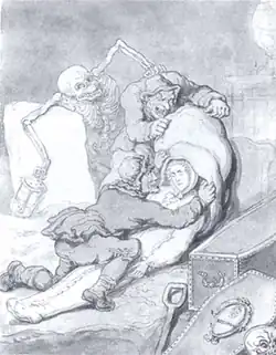 Occasionally, resurrectionists paid women to pose as grieving relatives, so that they might claim a body from a workhouse. Some parishes did little to stop this practice, as it reduced their funeral expenditure. Bodies were also taken from dead houses; Astley Cooper's servant was once forced to return three bodies, worth £34 2s, to a dead house in Newington parish. Bribes were also paid, usually to servants of recently deceased employers then lying in state, although this method carried its own risks as corpses were often placed on public display before they were buried.[48] Some were taken from private homes; in 1831 The Times reported that "a party of resurrectionists" burst into a house in Bow Lane and took the body of an elderly woman, who was being "'waked' by her friends and neighbours". The thieves apparently "acted with the most revolting indecency, dragging the corpse in its death clothes after them through the mud in the street".[49] Bodies were even removed—with no legal authority—from prisons and naval and military hospitals.[50]