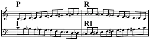 In music theory, retrograde inversion is a musical term that literally means "backwards and upside down": "The inverse of the series is sounded in reverse order."[1] Retrograde reverses the order of the motif's pitches: what was the first pitch becomes the last, and vice versa.[2] This is a technique used in music, specifically in twelve-tone technique, where the inversion and retrograde techniques are performed on the same tone row successively, "[t]he inversion of the prime series in reverse order from last pitch to first."[3]