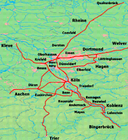 The company, which had previously operated only on the western side of the Rhine, opened a route across the Rhine on 1 September 1866 to connect with its Ruhr line from Osterath via Uerdingen, Rheinhausen, the Rheinhausen–Hochfeld train ferry across the Rhine, Duisburg-Hochfeld, Mülheim-Speldorf, Mülheim (RhE), Mülheim-Heißen to Essen Nord (RhE).