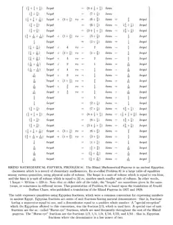 - ^ a b Chace, Arnold Buffum (1979) [1927–29]. The Rhind Mathematical Papyrus: Free Translation and Commentary with Selected Photographs, Translations, Transliterations and Literal Translations. Classics in Mathematics Education. Vol. 8. 2 vols (Reston: National Council of Teachers of Mathematics Reprinted ed.). Oberlin: Mathematical Association of America. ISBN 0-87353-133-7.
