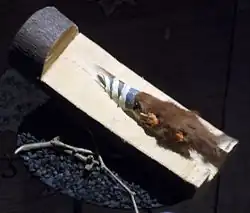 Rhinogradentia has been included in a number of museum exhibitions and collections. The National Museum of Natural History's Nasoperferator announcement was accompanied by a two-month exhibit honoring the animals, featuring purported stuffed specimens in its gallery of extinct species.[26] Mock taxidermies of rhinogrades have also been included in an exhibit at the Musée d'ethnographie de Neuchâtel,[27] and in the permanent collections of the Musée zoologique de la ville de Strasbourg and the Salzburg Haus der Natur.[28][29][2]