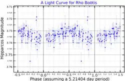 This is an evolved K-type giant star, currently on the red-giant branch, with a stellar classification of K4 III[3] and an estimated age of 4[6] billion years. Since 1943, the spectrum of this star has served as one of the stable anchor points by which other stars are classified.[13] With around 1.23 times the mass of the Sun, it has expanded to 20.6 times the Sun's girth. The star is radiating 129 times the Sun's luminosity from its enlarged photosphere at an effective temperature of about 4,285 K.[6] Rho Boötis is classified as a RS Canum Venaticorum variable.[4] Koen and Eyer examined the Hipparcos data for this star, and found that it varied with a period of 5.214 days, and an amplitude of 0.0027 magnitudes.[14]