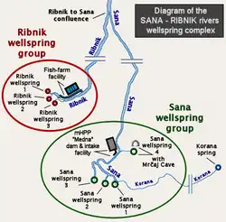 The Ribnik river, just like the Sana in its upper course, is classified mountain river with upland freshwater ecology, with its very clear and cold waters, classified as the Class I (or A) purity. Gushing out of the karst plateau with Ovčara as its most prominent summit (1576 m), between the Klekovačan and Vitorog mountains. The springs of both the river Sana and the Ribnik are located in the municipality of Ribnik, in Bosnia and Herzegovina, in the wider area of the villages of Gornji and Donji Vrbljani. The Ribnik basin comprises about 447 square kilometres.[5]