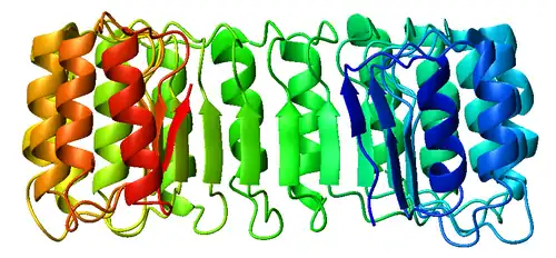 Ribonuclease inhibitor (RI) is a large (~450 residues, ~49 kDa), acidic (pI ~4.7), leucine-rich repeat protein that forms extremely tight complexes with certain ribonucleases. It is a major cellular protein, comprising ~0.1% of all cellular protein by weight, and appears to play an important role in regulating the lifetime of RNA.[2]