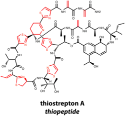 - ^ Liao R, Duan L, Lei C, Pan H, Ding Y, Zhang Q, Chen D, Shen B, Yu Y, Liu W (2009). "Thiopeptide biosynthesis featuring ribosomally synthesized precursor peptides and conserved posttranslational modifications". Chemistry & Biology. 16 (2): 141–7. doi:10.1016/j.chembiol.2009.01.007. PMC 2676563. PMID 19246004.