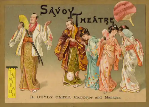 Carte produced the first revival of The Sorcerer, together with Trial by Jury, and matinees of The Pirates of Penzance played by a cast of children, while he waited for his partners to finish writing the new work. This became the partnership's most successful opera, The Mikado, which opened in March 1885.[107] The piece satirised British institutions by setting them in a fictional Japan and took advantage of the Victorian craze for the exotic and "picturesque" Far East.[108] The Mikado became the partnership's longest-running hit, lasting for 672 performances at the Savoy Theatre, and supplanting Patience as the second-longest-running work of musical theatre up to that time.[68] It was extraordinarily popular in the US and worldwide and remains the most frequently performed Savoy Opera.[109] The partnership's next opera was Ruddigore, which opened in January 1887. The piece, though a financial success, was a relative disappointment after the extraordinary run of The Mikado.[110] When Ruddigore closed after 288 performances over nine months, Carte mounted revivals of earlier Gilbert and Sullivan operas at the Savoy for almost a year.[111] After another attempt by Gilbert to persuade Sullivan to set a "lozenge plot", Gilbert met his collaborator half way by writing a serio-comic plot for The Yeomen of the Guard, which premiered in October 1888.[112] The opera ran for over a year, with strong New York and touring productions. This was a happy time for Carte, with a long-running opera, new marriage and new hotel and opera house under construction.[107] When Carte asked his partners for a new work, Sullivan again expressed reluctance to write another comic opera, asking if Gilbert would write a "dramatic work on a larger musical scale".[113] Gilbert declined but offered a compromise that Sullivan ultimately accepted: the two would write a light opera for the Savoy, and at the same time, Sullivan could work on a grand opera that Carte would produce at a new theatre he was planning to build to present British grand opera.[114] The new comic opera was The Gondoliers, which opened in December 1889 and became one of the partnership's greatest successes, with an initial run of 554 performances.[115]