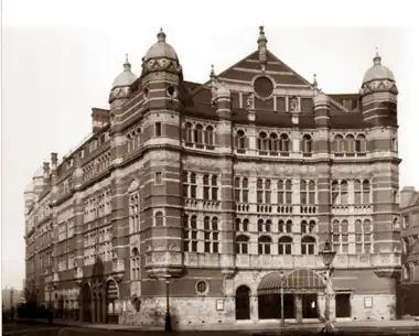 Carte's first production at the Royal English Opera House was of Sullivan's only grand opera, Ivanhoe, which opened in January 1891. It played for an initial run of 155 performances, a record for an opera. When it finally closed in July, Carte had no new work ready to play at the opera house, and so it had to close. The opera house re-opened in November 1891 with André Messager's La Basoche at first alternating in repertory with Ivanhoe, and then La Basoche played alone, closing in January 1892.[1] Carte again had no new opera to present at the house, and the venture soon failed. Sir Henry Wood, who as young man had been répétiteur for the production, recalled in his autobiography, "If D'Oyly Carte had had a repertory of six operas instead of only one, I believe he would have established English opera in London for all time. Towards the end of the run of Ivanhoe I was already preparing The Flying Dutchman with Eugène Oudin in the name part. He would have been superb. However, plans were altered and the Dutchman was shelved."[123] Carte leased the theatre to Sarah Bernhardt for a season and finally abandoned the project. He sold the opera house at a loss to the impresario Sir Augustus Harris.[1] It was then converted into a music hall, the Palace Theatre of Varieties, and later became the Palace Theatre.[124][125]