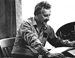 In 1953, the Lovings left Manhattan for the Brando family's farm, Pennypoke, near Mundelein, Illinois.[24][26] Loving converted the property's barn and out-buildings into a family-operated jewelry workshop and art studio, including a large kiln that he built in order to produce large-scale enamel artworks.[27][24][29] During that time, Loving exhibited at the Bloomington Art Association (1957) and Lawrence College (1963), and in the exhibition, "Enamels" (Museum of Contemporary Crafts, New York, 1959), developing what art historian Franz Schulze later called " a modest, static local reputation in craft circles."[14][10][30]