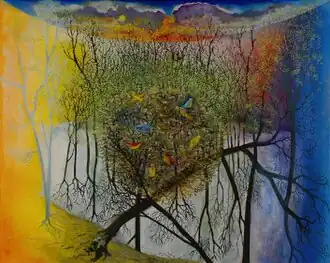 This later work offered an increasingly complex mix of naturalism and enigmatic theatrical spaces that writers say shifted interpretation from literal toward more poetic and mysterious narrative, symbolic and metaphorical frameworks.[11][54][8][53] Paintings such as In a Budding Grove (2008) or Fall and Flowers (2009) combine familiar natural settings with formal devices such as unnatural curtain-like bands of light and glowing, curved horizon lines that seem to enclose the landscapes.[11][54][8] James Yood compared them to late medieval altarpieces, whose nuance and iconography suggested "both the physical and metaphysical, the prospect of a dense zone of nature gone wild and also an immersion into the forces—spiritual, chlorophyllic, reproductive, etc.—that in their aggregate comprise the dictates of life."[11]