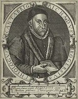 He was born in 1550 or 1551 to John Rogers (died 1558) and Agnes Carter (1500–1559). Family tradition in the 17th century claimed that he was the son or grandson of the steward to the earls of Warwick, but since there was no Earl of Warwick during that time, genealogists have disproved this claim.[1] He matriculated as a sizar of Christ's College, Cambridge, in November 1565, and graduated B.A. 1571, M.A. 1574.[2] He was appointed lecturer at Wethersfield, Essex, about 1577.