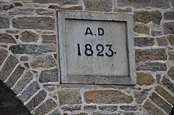 The 1825 depiction shows the Bridge did not at its completion have the 1823 stone plaques attached above its central pier; the three middle piers were originally traditional vertical cutwaters identical to the two piers as still seen today at water's edge, and did not have the quite bulky elongated hexagonal plan cutwaters (added in 1884/5); and the townside bridge approach followed the same gentle downward slope design as still exists at the eastern end and as seen in the lower road level string course. This modification was made in 1834/5 and was undertaken for bridge approach safety reasons. The bronze plaque is a recent addition on the roadside inner wall, added in 1991.
