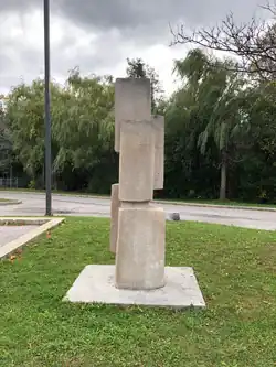 Situated in front of the main entrance of the present Yorkland Street building, in the grass median between the incoming and outbound driveways, is a sculpture entitled "Books" created by renowned and deceased Canadian sculptor E.B. Cox.