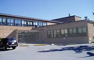It was built at the same time as Laurentian High School and Rideau High School and has the same base design by architects Hazelgrove, Lithwick and Lambert with well-lit efficient circulation, and a large auditoria. The double gymnasium block projected into a large sports field and oval track.[1] For adults, commercial and business classes were offered in the evenings. There are tennis courts, a large parking lot, well equipped science labs, an auto shop, a wood shop, a media lab and a library. There are two storey t-shaped wings for classrooms, with the gym, auditorium and cafeteria in bumped out blocks. The building was constructed of orange-buff brick with contrasting brick in perpendicular bars on the fly over the auditorium stage. At Ridgemont the auditorium stage fly was decorated at the corners in contrasting brick. There were horizontal bands of windows in silver aluminum, which were later retrofitted with tinted glass in brown anodized frames. An entrance forecourt is reached by a circular drive. The main door is through a vestibule set at an angle between a classroom wing and the cafeteria block. The school's most architecturally interesting feature is a smokestack with a heavy fire door at the base for cleaning out the ash and soot.[2]