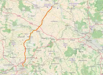 In Riesa station the line branches off along with the branch line to Nossen from the Leipzig–Dresden line. The line to Nossen branches off the left and runs to the south, while the Chemnitz line runs to the south-west and passes over highway B 169. The northern section runs through relatively flat land until the Döbeln area; the only significant engineering works on this section is the 130 m-long viaduct near Ostrava and the 80 m-long bridge over the Mulde outside Döbeln station. Near the Döbeln-Nord motorway junction, it crosses the A 14, and after crossing the Freiberger Mulde it runs to the now single-track and non-electrified main line from Coswig via Borsdorf to Leipzig. Döbeln Hauptbahnhof is built at the junction of two lines as a V-shaped station. The station building is located between the tracks from Riesa and Meissen.
