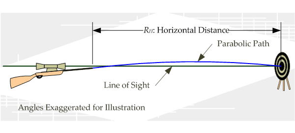 This relationship between the LOS to the target and the bore angle is determined through a process called "zeroing." The bore angle is set to ensure that a bullet on a parabolic trajectory will intersect the LOS to the target at a specific range. A properly adjusted rifle barrel and sight are said to be "zeroed." Figure 3 illustrates how the LOS, bullet trajectory, and range () are related.
