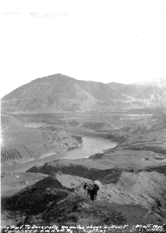 Less celebrated than its wagon-road contemporaries, the Old Cariboo Road and later on the Cariboo Road proper, the River Trail (also known as the "Mule Trail") was the choice for most prospectors and travellers heading north from Lillooet who could either not afford the tolls of the Old Cariboo Road, or had no need of it as the River Trail sufficed for foot-travel or horse travel with small packtrains. The wagon roads were built for freight wagons and stage travel, and also went up and over mountains and plateaus which travel via the River Trail did not require. Water was in short supply on this route, which is semi-desert for most of its length as far north as what is now Williams Lake, and the route was very rugged, but was favoured due to its lower elevation and more temperate climate than the official and more-documented routes eastward over the plateaus. One visitor to Fountain, then Upper Fountains, a staging ground for wagon trains 10 miles (16 km) upstream from Lillooet, commented that there were few travellers on the wagon road itself, but that a steady line of men and some horses could be seen threading the difficult valley trail in the canyon-bottom below, "like a line of ants" .