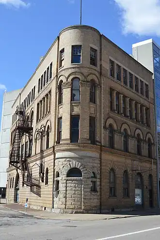 The Riverside Iron Works Office Building is a historic commercial building at 1507–09 Main Street in Wheeling, West Virginia. It is a four-story masonry structure, triangular in shape, and built out of light-colored brick with stone trim elements. The first three floors, built in 1896, are Richardsonian Romanesque in style, with rusticated stone elements on the ground floor at the rounded corner, and round-arch settings for doors and windows. The fourth floor, simpler in style, was added about 1907. It was built for the Riverside Iron Works, Wheeling's leading steel manufacturers at the time, and served as its headquarters until 1898, when the company was acquired by National Tube Company.[2] In form, it is a flatiron building.