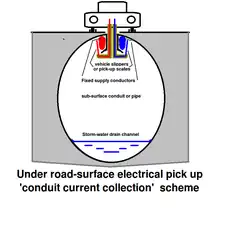 Ground-level power supply is an alternative to overhead power lines. The most common version is the conduit current collection system, where the power supply is carried in a channel or vault under the roadway. This is a tube, open at the top to allow a blade to enter and extend slippers against the power conductors, which are either side of the access opening slot, near the top of the channel. The arrangement is shaped so that live surfaces can not be reached by hand, and the lower part of the conduit provides drainage to remove any water.