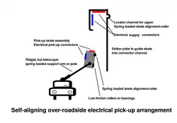 Online Electric Vehicles (OHVs) use pick-up equipment underneath the vehicle then collects power through non-contact magnetic induction, which may imply a similar electrical design.