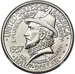 The Roanoke Island, North Carolina, half dollar (also Roanoke Island half dollar) is a commemorative coin issued by the United States Bureau of the Mint in 1937. The coin commemorated the 350th anniversary of the Roanoke Colony, depicting Sir Walter Raleigh on one side, and on the other Eleanor Dare, holding her child, Virginia Dare, the first child of English descent born in an English colony in the Americas.