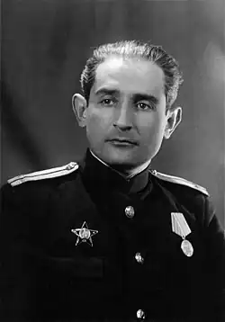 Diament was assigned to document the combat operations of the Soviet Northern Fleet.[3][4] His work encompassed photography on land, at sea, and in the air, including flights with torpedo bombers to intercept enemy convoys. Conway notes that Robert Diament "was the official Soviet Navy photographer, working mostly with the Northern Fleet, covering Arctic operations and focussing frequently upon the heroic aspects of the individual sailors involved"[5] For instance, in 1942, Diament created one of his most famous photographs, a grinning portrait of marine landing force sailor Grigory Pashkov on the Rybachy Peninsula.[6] This image became an iconic representation of Soviet sailors during the Great Patriotic War.[7]